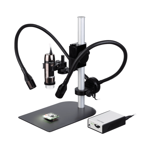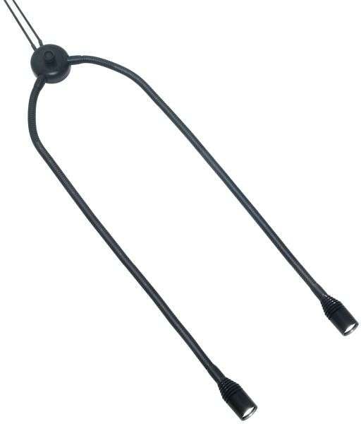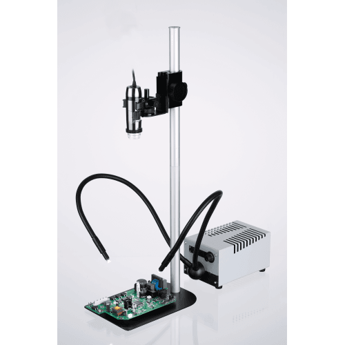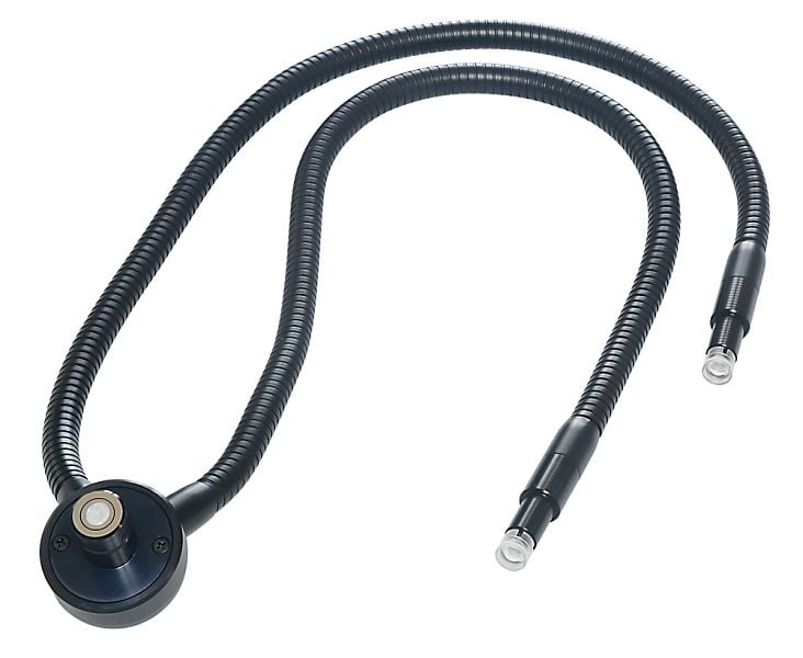 Strålkastarna med hög effekt måste sättas snabbt på den inkluderade kontrollhållaren. Den här hållaren för strålkastare sätts fast på den runda bottenplattan. Med den här uppsättningen kan du skapa två enskilda strålkastare med hög effekt och flexibla armar. Då den sätts fast på bottenplattan, går den att sättas fast var som helst runt stickprovet, som skapar total flexibilitet. Ljusstyrkan kan styra med den kompakta kontrollenheten. Dessutom kan du sätta på/ta av de två armarna enskilt.