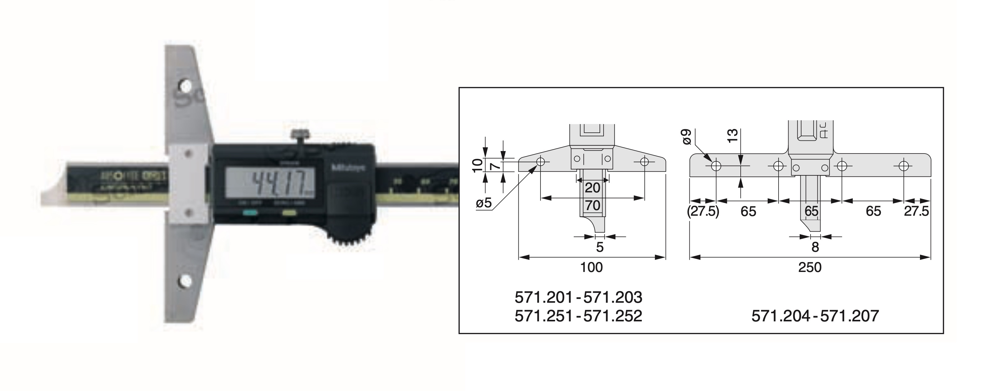 - Mitutoyo djupskjutmått med Absolute mätsystem. För användning i verkstadsförhållanden har Mitutoyo också utvecklat Coolant Proof modeller med hög skyddsgrad (IP67); dessa är resistenta mot olja och kylvätskor och tål även tillfällig nedsänkning.