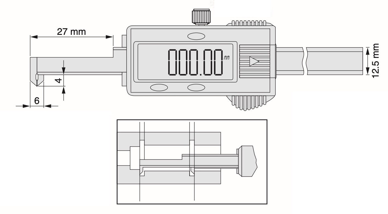 • Skjutmått med utvändigt vinklade, spetsiga mätkäftar för mätning av invändiga spår