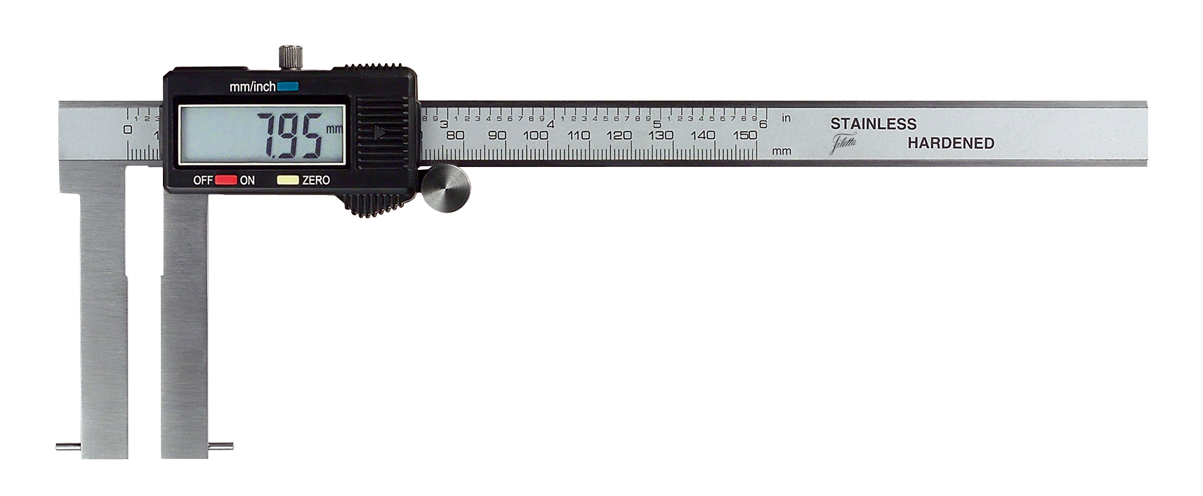 Skjutmåttet är utrustat med lättavläst LCD-display som visar mätvärden med tydliga siffror. Enheten har funktioner för nollställning var som helst inom mätområdet och möjlighet att växla mellan metriska enheter och tum. Den specialutformade mätspetsen är konstruerad för att komma åt svårtillgängliga områden, vilket gör detta skjutmått särskilt användbart för mätningar på platser med begränsat utrymme.