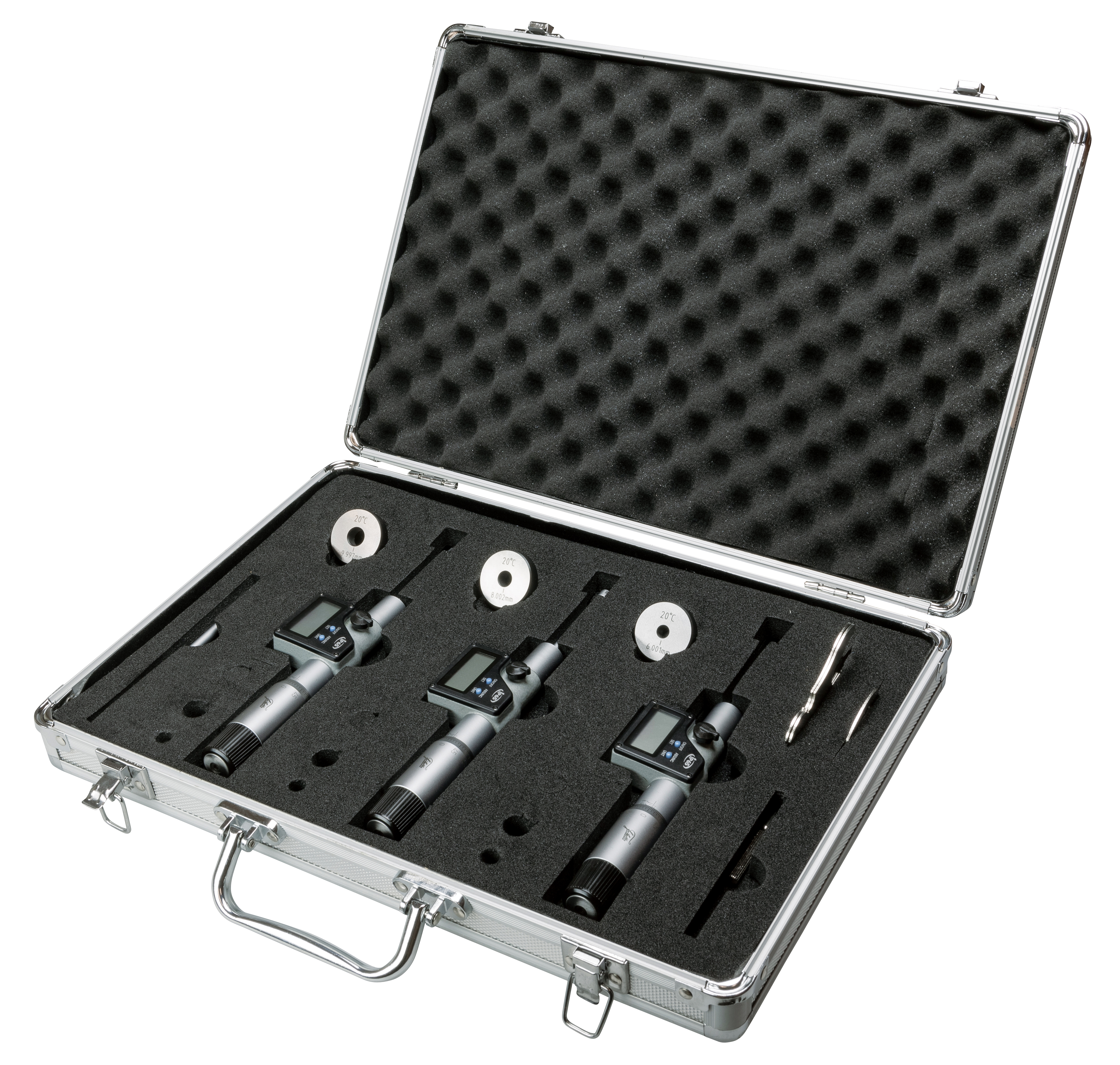 - Tre-punkts invändiga mikrometer med fabriksmätrapport för noggrann mätning av (blinda) borrningar.